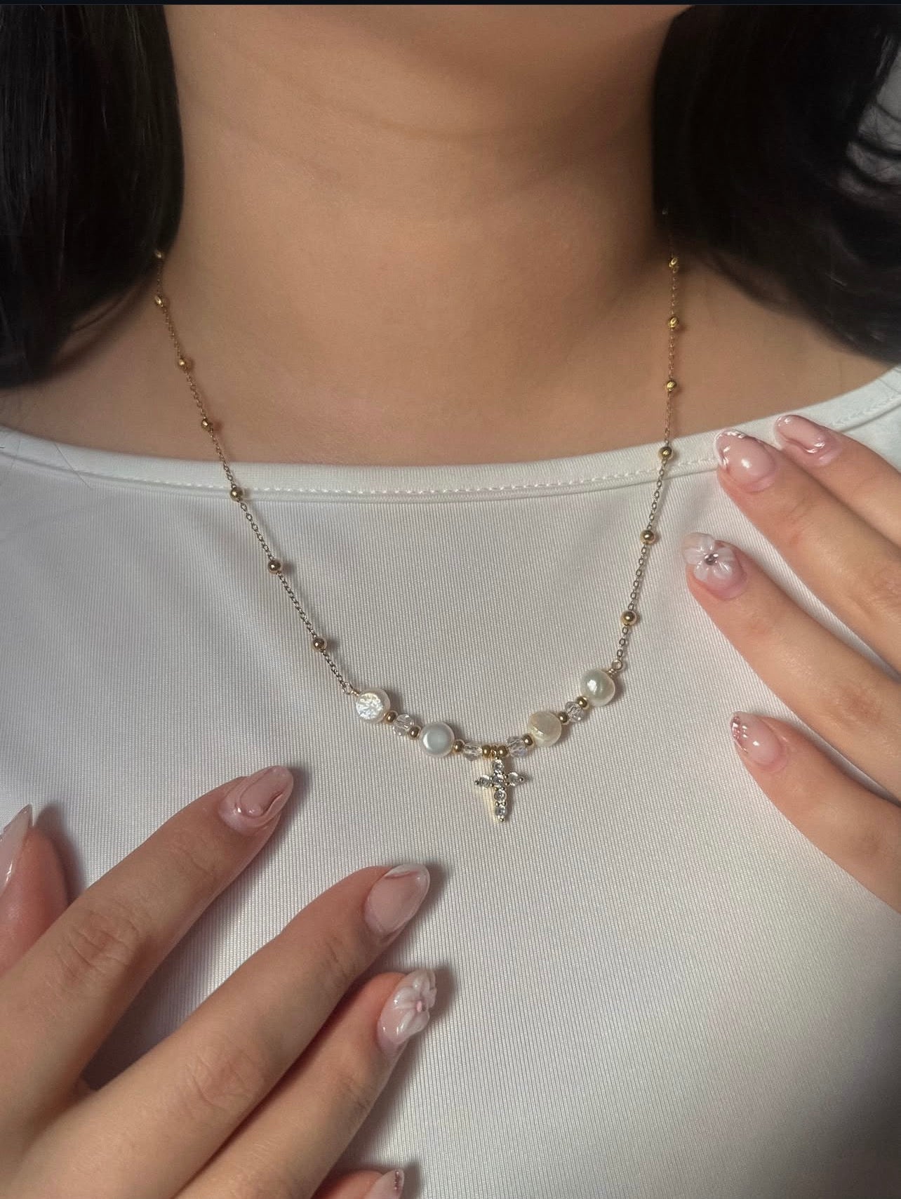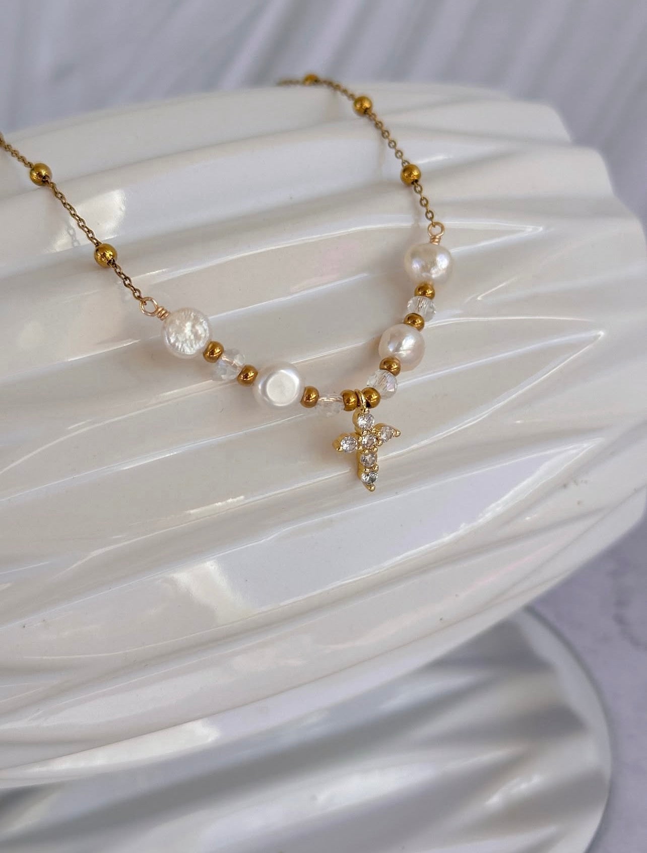 Acero inoxidable + Perlas + Cristales + Dije en enchape de oro