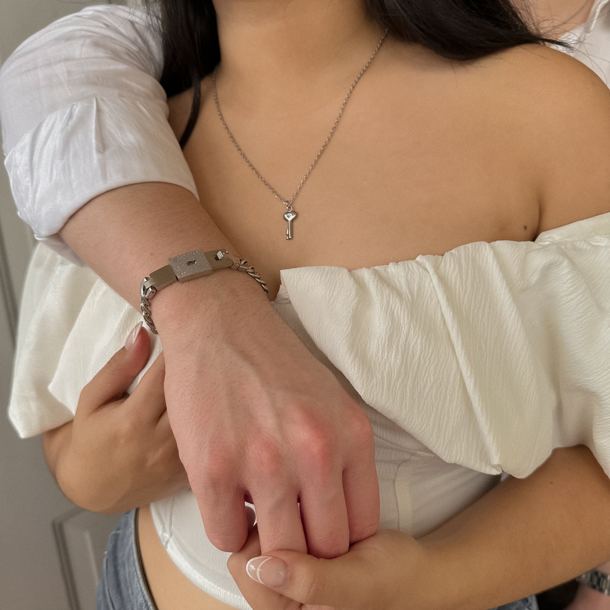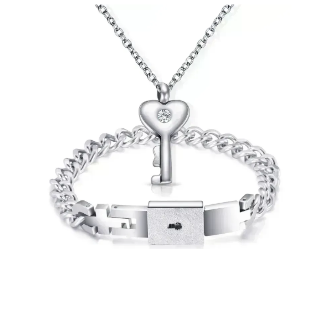 ¡Demuéstrale a tu pareja lo mucho que significan juntos con nuestro set "We belong together"! Este set incluye una pulsera y cadena de acero inoxidable, simbolizando la unión entre dos personas. La cadena es una llave que abre la pulsera, representando que juntos tienen la clave para un amor duradero. ¡Haz que su amor brille con este original set!